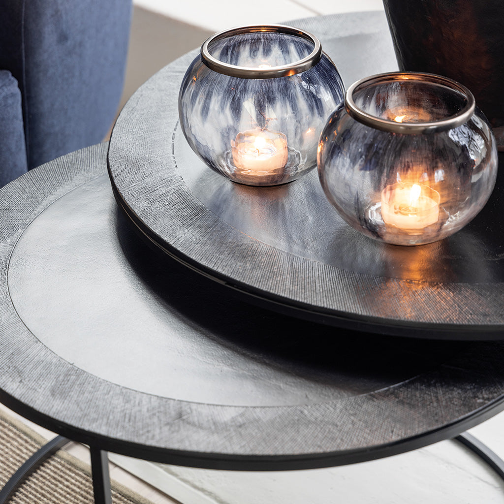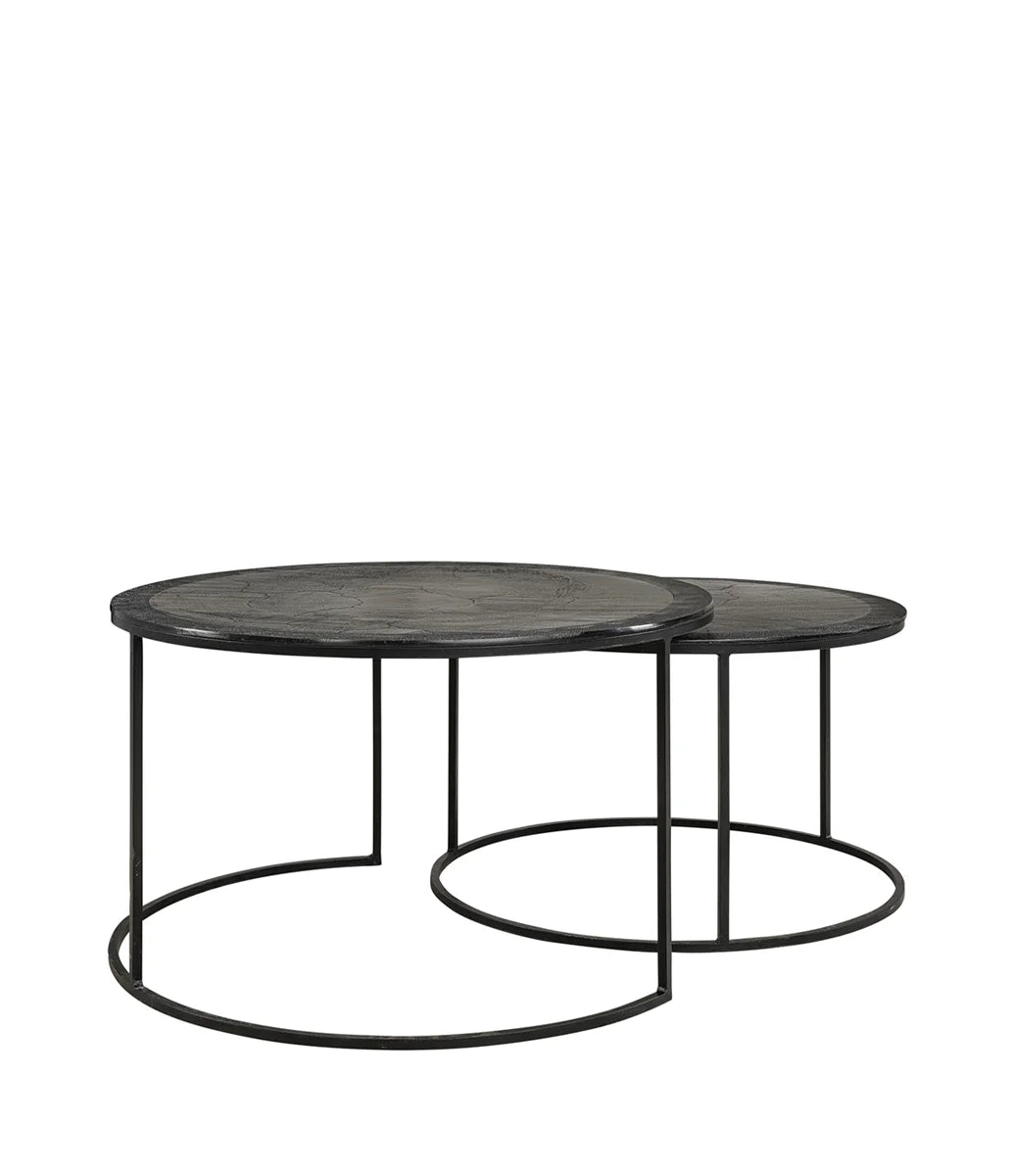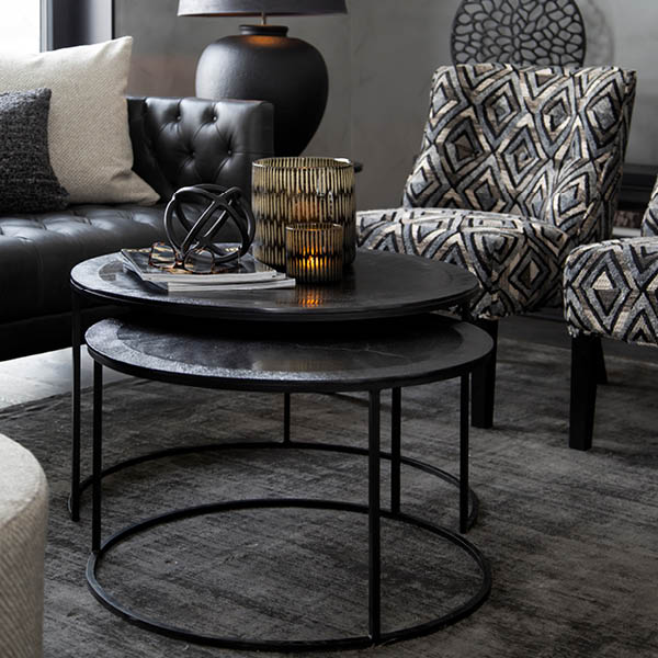 Amadeo-bordene kommer i en praktisk 2-pakning og er perfekte som salongbord eller sidebord. Laget av svart aluminium med en solid metallramme, kombinerer de holdbarhet med tidløst design. Den avrundede bordkanten med et dekorativt mønster gir en unik og stilig detalj som forsterker bordenes estetiske appell.