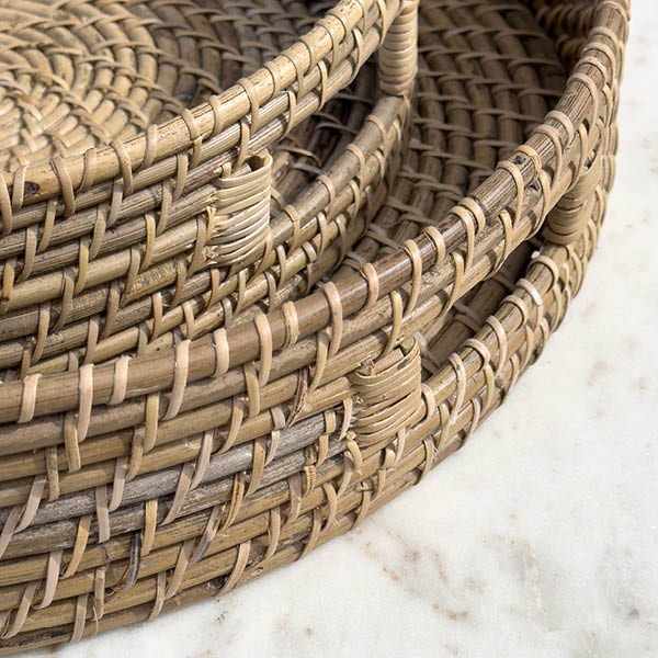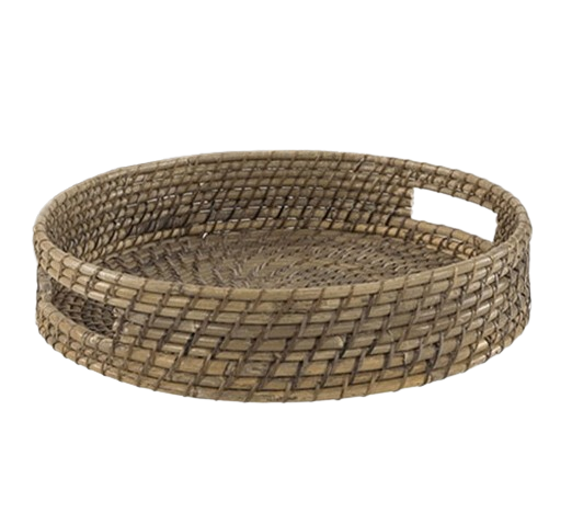 Rottingbrett utstyrt med praktiske håndtak for enkel håndtering. Perfekt for servering av frokost på sengen, kaffe til gjester, eller som dekorativ base for stearinlys og andre dekorartikler. De håndflettede brettene kombinerer naturlig skjønnhet med funksjonalitet, noe som gjør dem til et allsidig og stilig tillegg til hjemmet ditt.