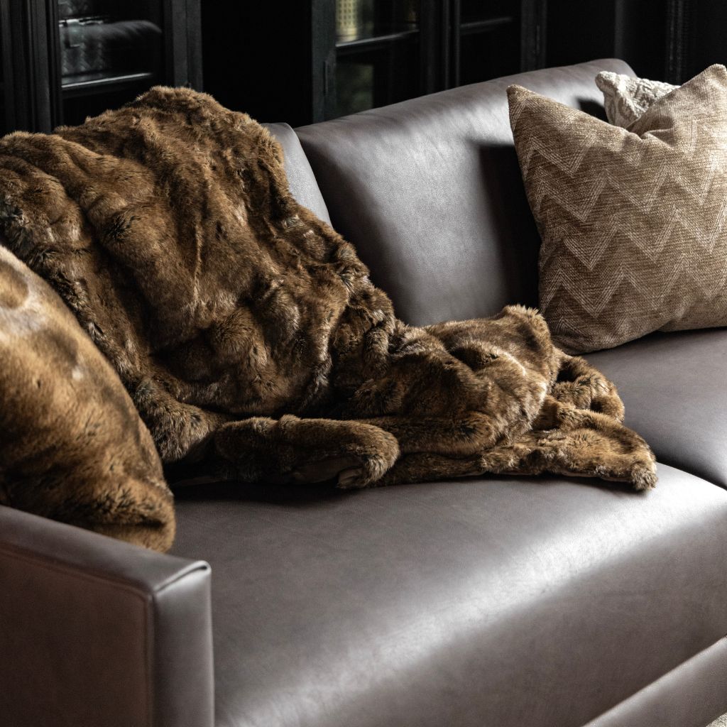 Et pledd med fuskepels på forsiden og mykt stoff med naturlig tekstur på baksiden. Perfekt for å skape en koselig og elegant atmosfære i hjemmet ditt.