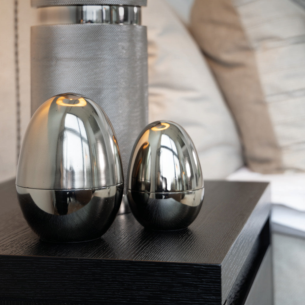 2-pakning dekorative, åpningsbare metallegg i sølv. Laget utelukkende av metall av høy kvalitet, er disse allsidige eggene perfekte for oppbevaring av små skatter eller rett og slett for å tilføre eleganse til ethvert rom. Den skinnende finishen gir et luksuriøst og moderne utseende, noe som gjør dem til et ideelt tillegg til både moderne og klassisk interiør.