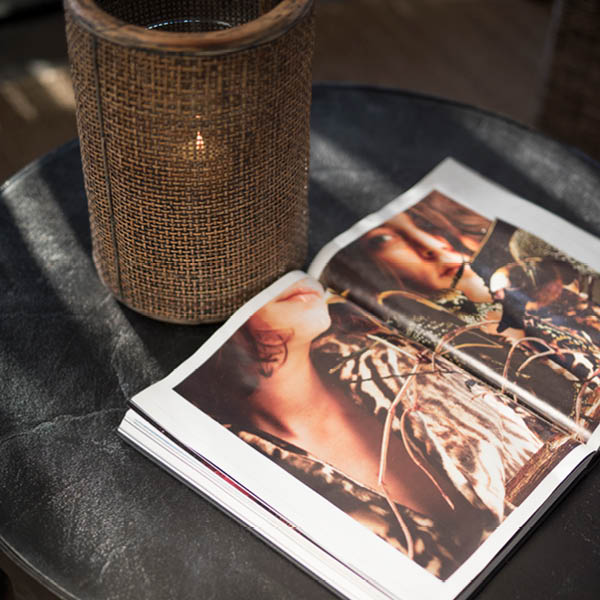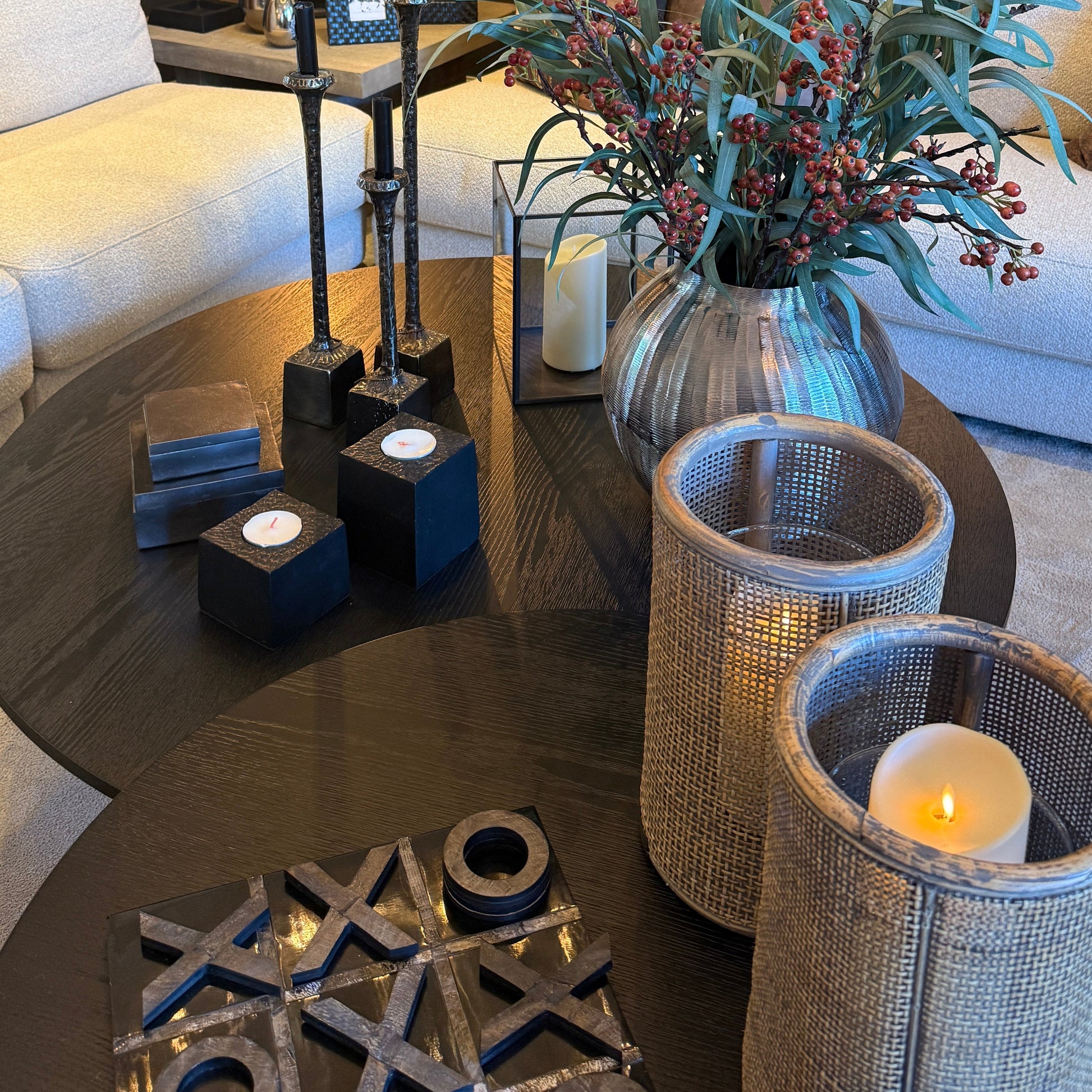 Lykt i vevd bambus med glassinnsats for stearinlys. Lykten har en dekorativ, naturlig stil som gir et mykt og koselig lys.