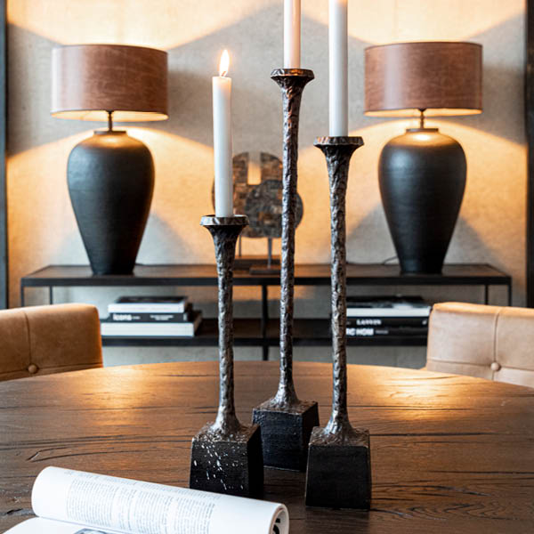 Et sett med tre elegante lysestaker i metall med hamret tekstur. Perfekt for å gi et preg av stil og varme til ethvert rom. De er slitesterke og allsidige, og passer til både moderne og klassisk interiør.