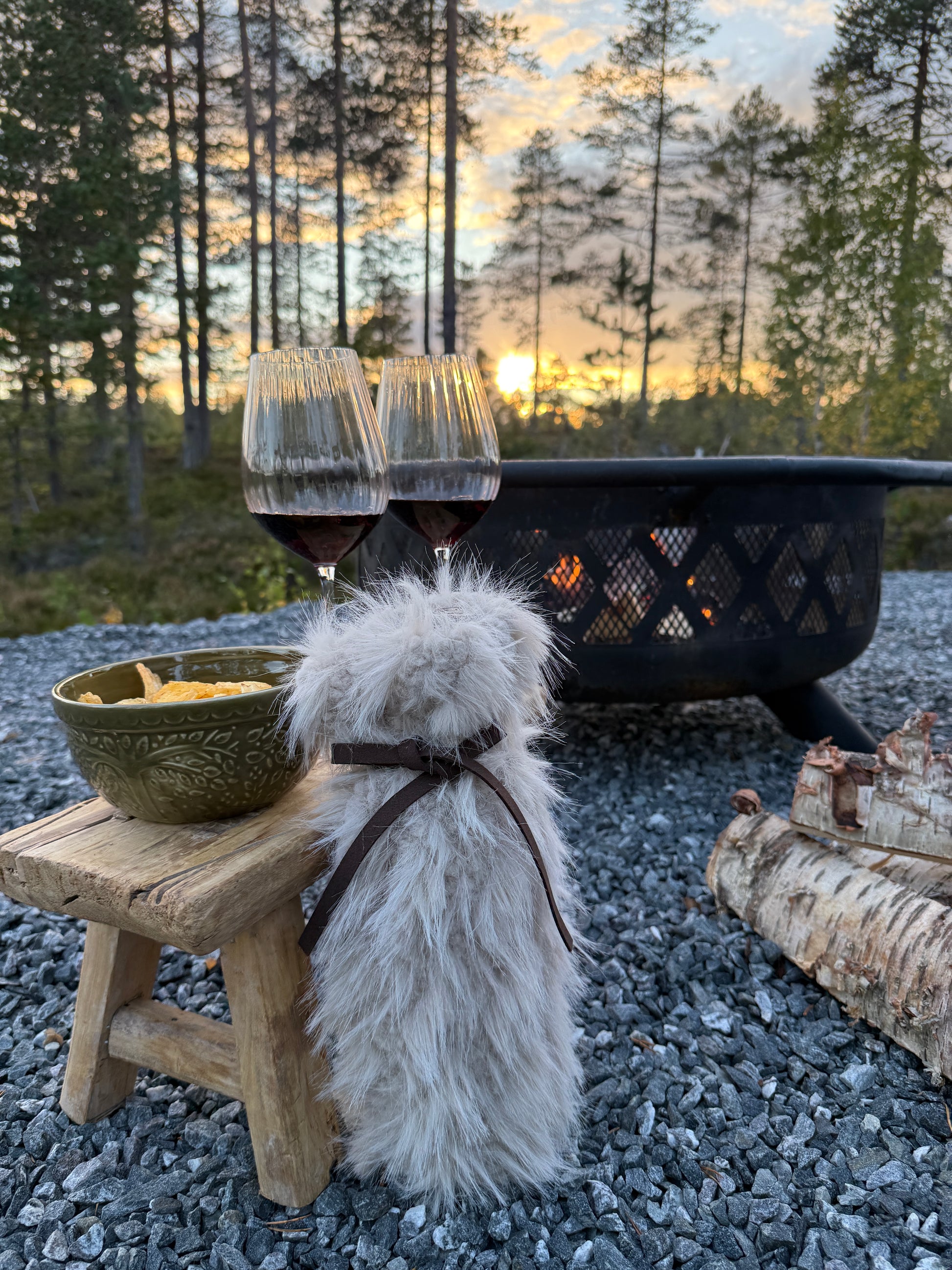 En vinpose i myk fuskepels med snøring i imitert skinn øverst. Perfekt til spisebordet eller som en vakker vertinnegave.