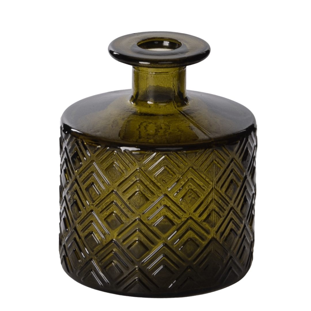 Liten sylinderformet glassvase med mønster i dyp olivenlgrønn-farge
