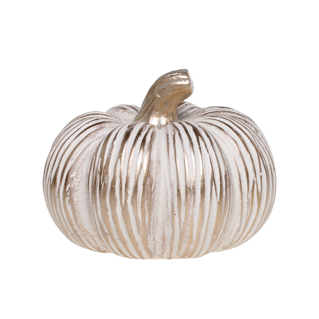 Dette gresskaret skiller seg ut med sin hvite, matte base og skinnende gullstriper som følger de naturlige rillene. Den gylne stilken på toppen gir en luksuriøs finish. Den både solid og lett, og egner seg perfekt for å plasseres på en hylle, et sidebord eller som en del av et midtpunkt på spisebordet.