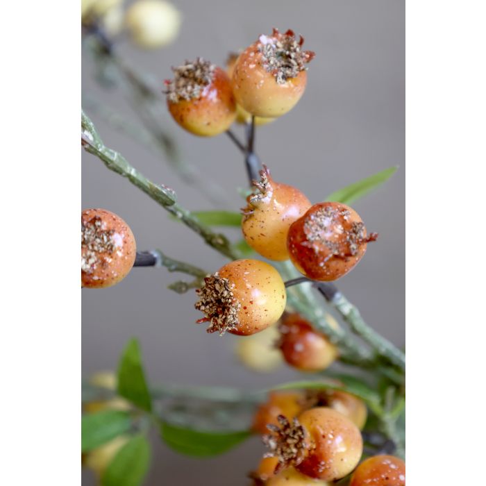 Tilfør en frisk og fargerik detalj til interiøret ditt med denne kunstige havtorn. Grenen er naturtro og har et vakkert utseende med sine små, oransje bær og grønne blader. Siden den er kunstig, krever den ingen stell og vil alltid se fresh og levende ut. Den kan brukes alene i en enkel vase for et minimalistisk uttrykk, eller kombineres med andre kunstige blomster og grener for å skape en frodig og personlig bukett. Den muntre gulfargen passer perfekt til å lyse opp et hjørne i hjemmet og er ideell for å markere en ny sesong.
