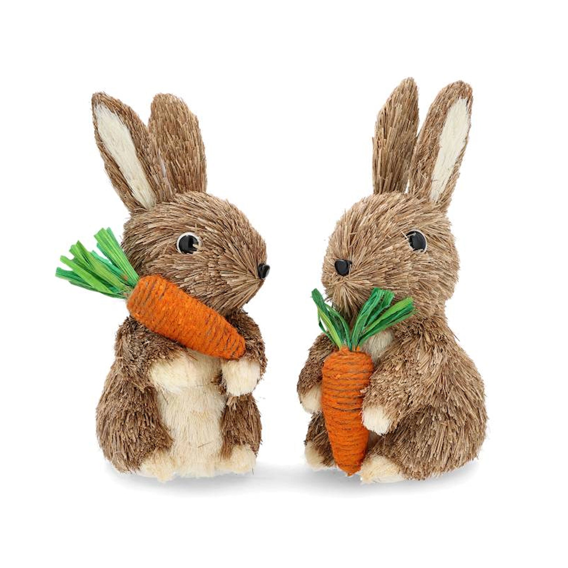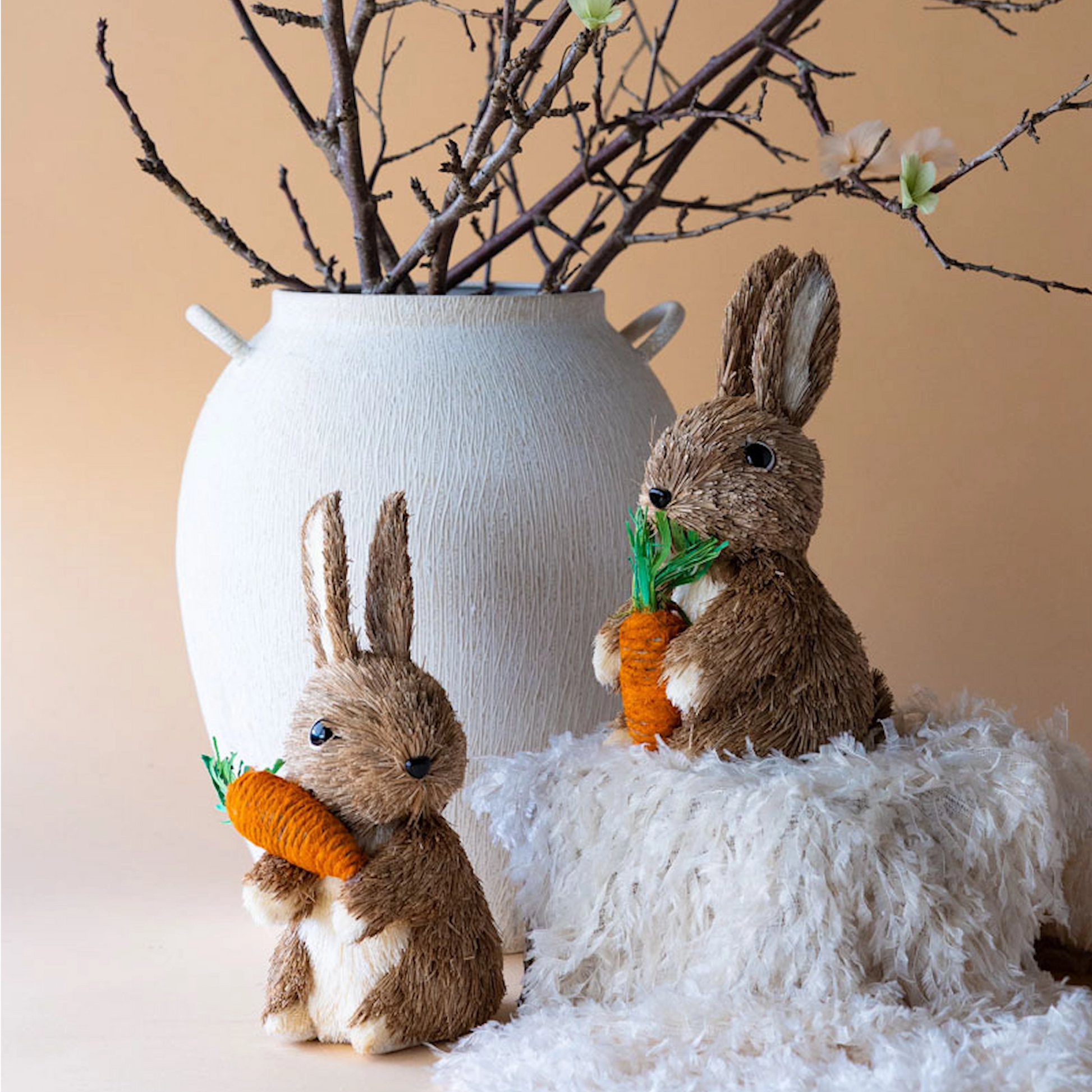 Disse søte kaninene, som hver holder en gulrot, vil være et lekent tillegg til interiøret ditt. Perfekt som påskedekorasjon. Laget av naturlige materialer.