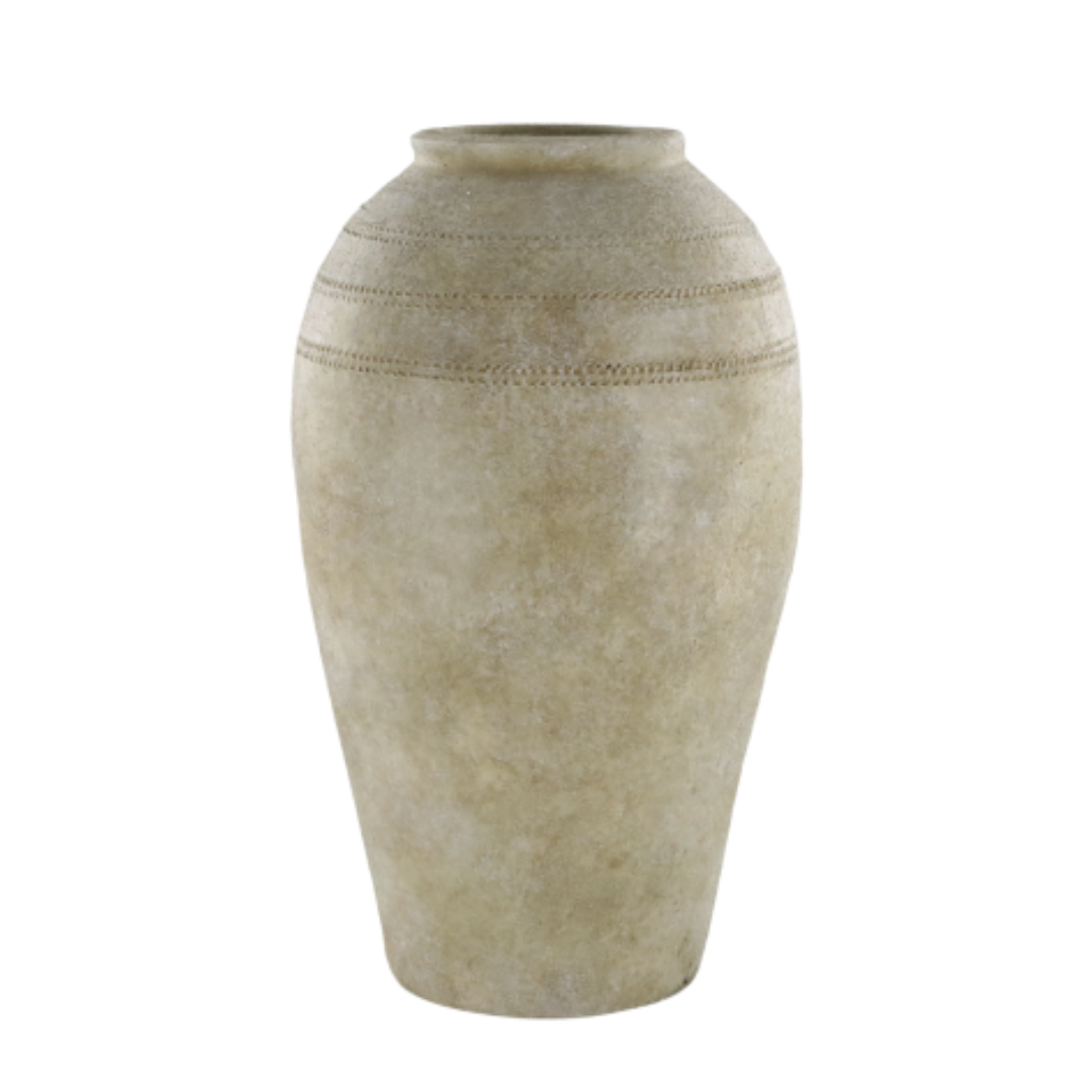 Denne potten er laget av robust terrakotta og har et sjarmerende, rustikt utseende med en matt overflate og diskré horisontale linjer. Hver potte er unik i sitt utseende og vil variere litt i farge og tekstur. Den er perfekt for å skape et naturlig og tidløst preg i hjemmet, enten du bruker den til en plante eller som en elegant pyntegjenstand.