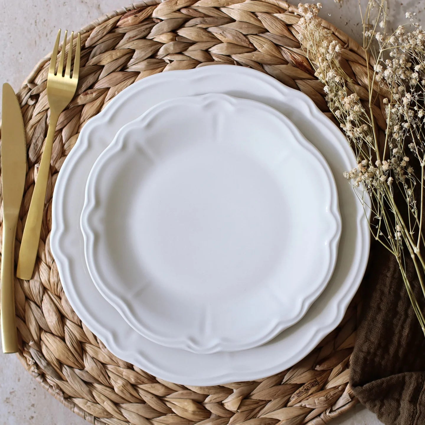 Lun-serien viser frem den autentiske sjarmen til keramikk med en serie diskré og elegante tallerkener. Med sitt tidløse design og diskré appell, passer disse tallerkenene sømløst inn i enhver borddekking, fra klassisk til moderne. Laget av hvitt steintøy av høy kvalitet, skiller de seg ut med sin robusthet og raffinerte finish. De er ideelle for hverdagsbruk samtidig som de gir et snev av raffinement til måltidene dine.