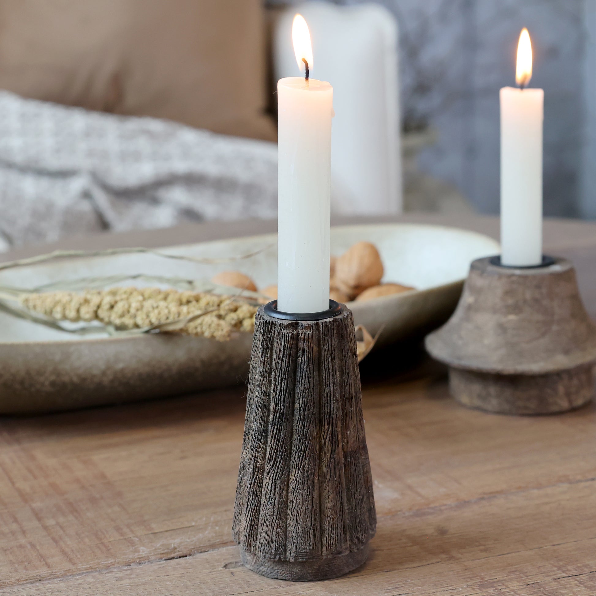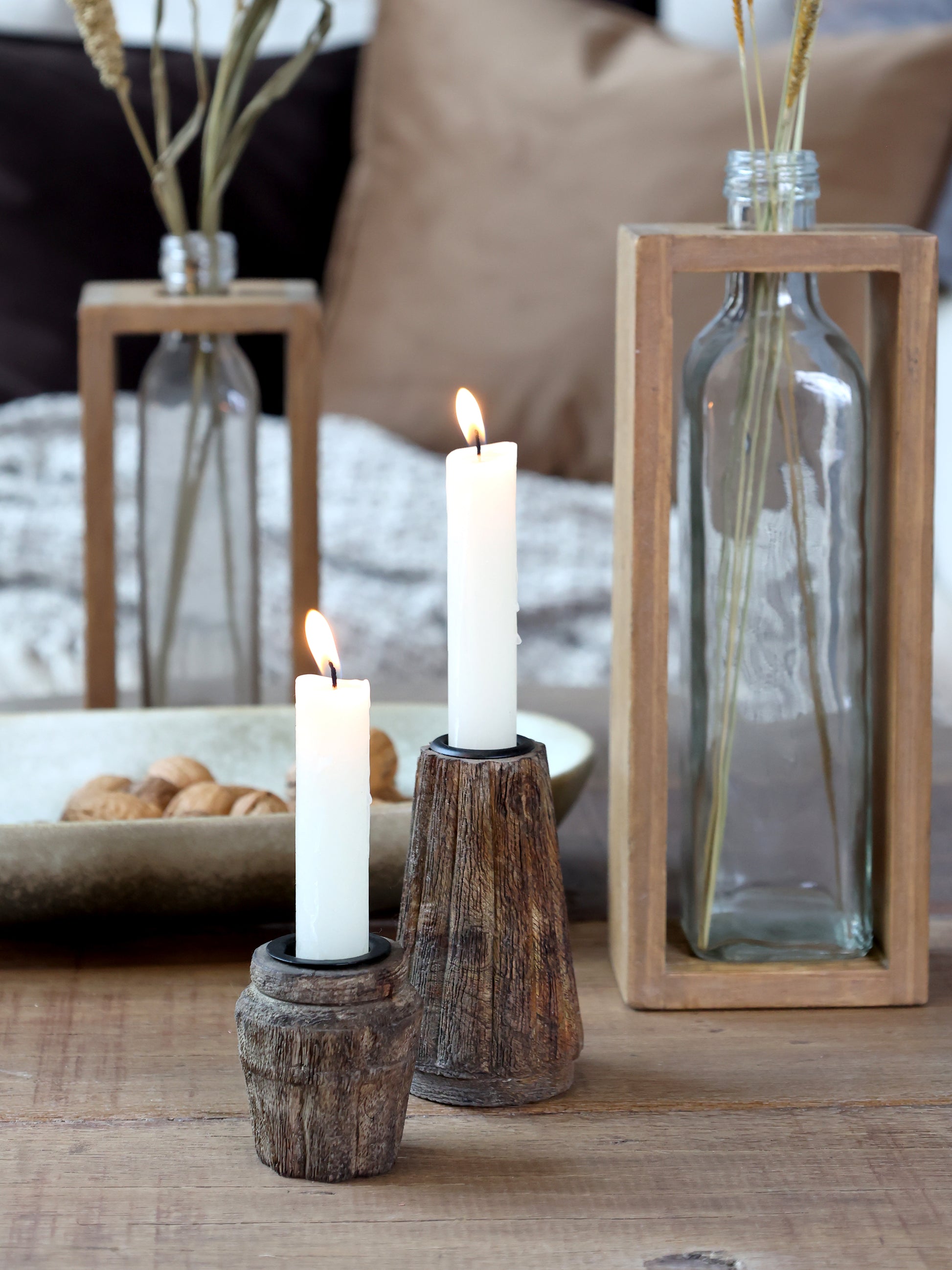 Denne rustikke lysestaken er laget av vakkert mangotre, og har en organisk form som gir den et autentisk og naturlig utseende. Den grove overflaten fremhever treets unike struktur og skaper en varm og tidløs følelse. Lysestaken er perfekt for å skape et lunt blikkfang på spisebordet eller i vinduskarmen, og den passer like godt alene som sammen med flere i ulike høyder.