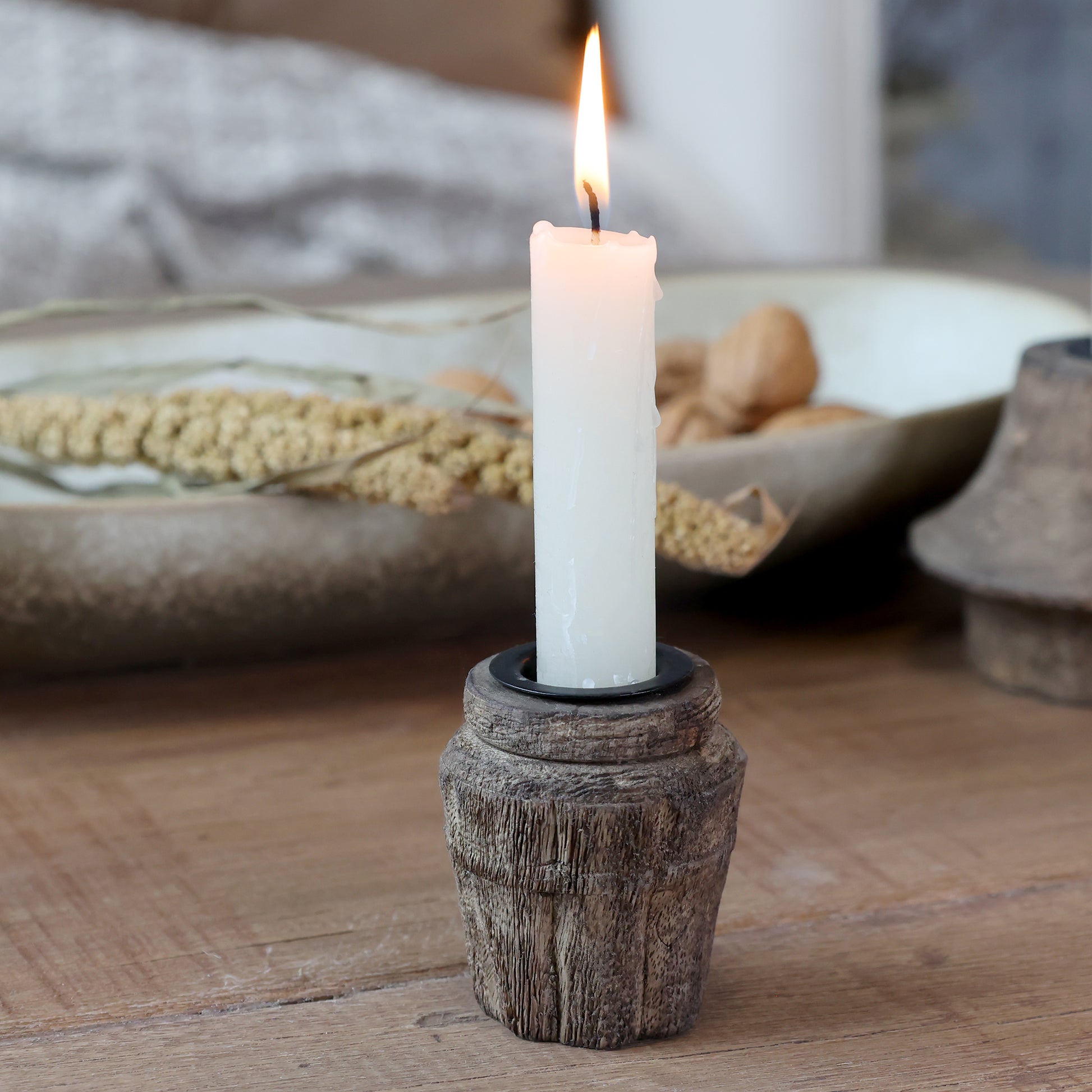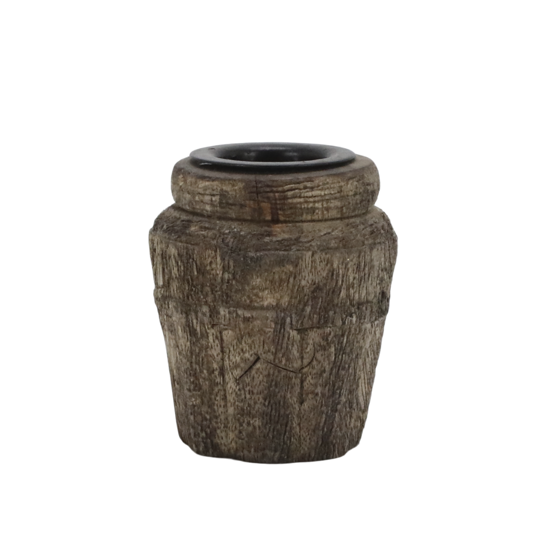 Denne rustikke lysestaken er laget av vakkert mangotre, og har en organisk form som gir den et autentisk og naturlig utseende. Den grove overflaten fremhever treets unike struktur og skaper en varm og tidløs følelse. Lysestaken er perfekt for å skape et lunt blikkfang på spisebordet eller i vinduskarmen, og den passer like godt alene som sammen med flere i ulike høyder.