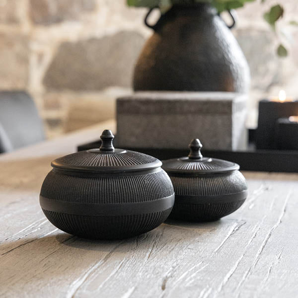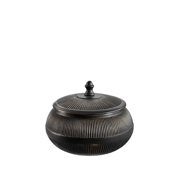 Rund dekorativ metallboks med lokk. Teksturert stripete overflate.
