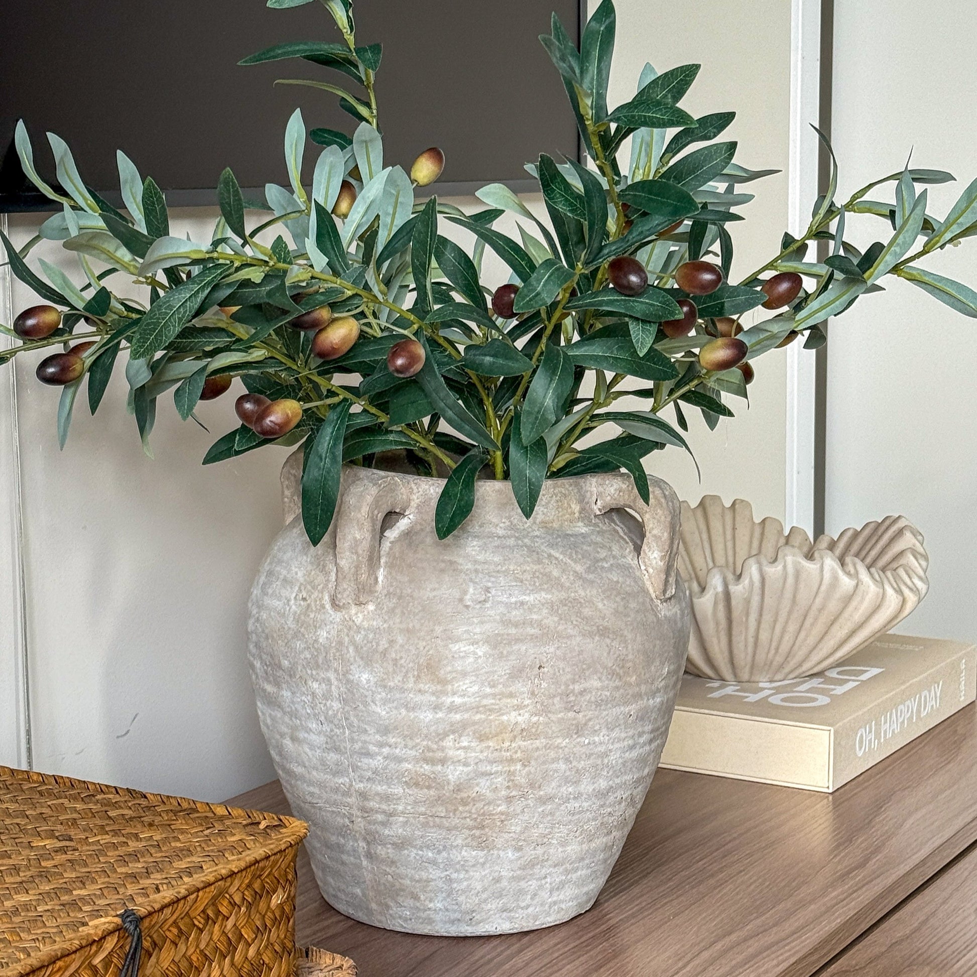 Tilfør et streif av middelhavssommer til hjemmet ditt med denne naturtro, kunstige olivengrenen. Grenen er designet med et realistisk utseende, fra de grågrønne bladene til de små, mørke olivenbærene som gir en autentisk følelse. Den er perfekt for å skape et enkelt og elegant uttrykk alene i en vase, eller for å gi en ekstra dimensjon til en større bukett. Siden den er kunstig, er den helt vedlikeholdsfri og vil se vakker og levende ut år etter år.