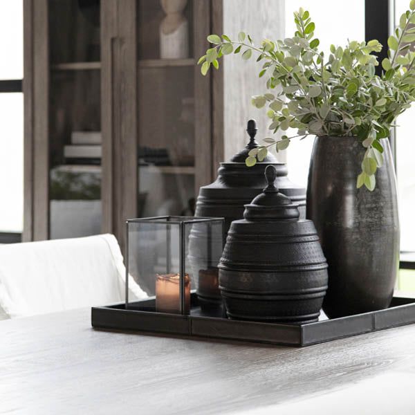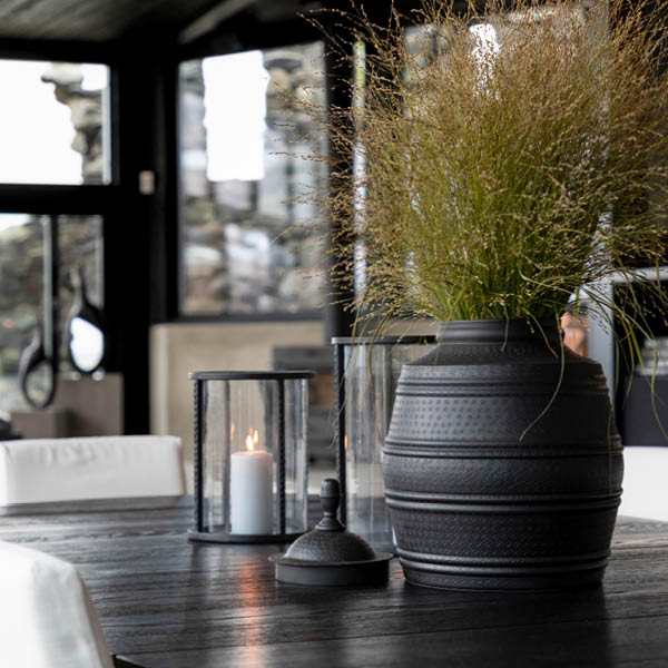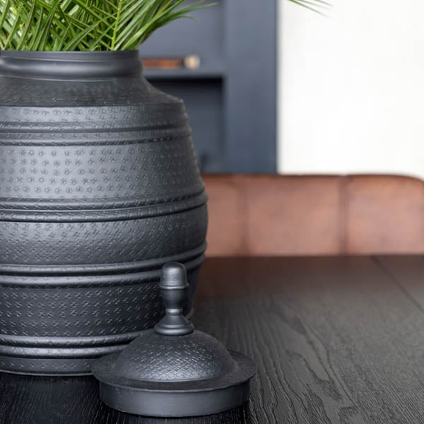 Dekorativ metallurne med lokk. Med et stripete mønster og teksturert overflate, gjør det elegante designet den til et perfekt blikkfang i hjemmet ditt. Enten du plasserer den i stuen, gangen eller på et skjenk, vil denne urnen gi rommet unik karakter og tidløs eleganse.