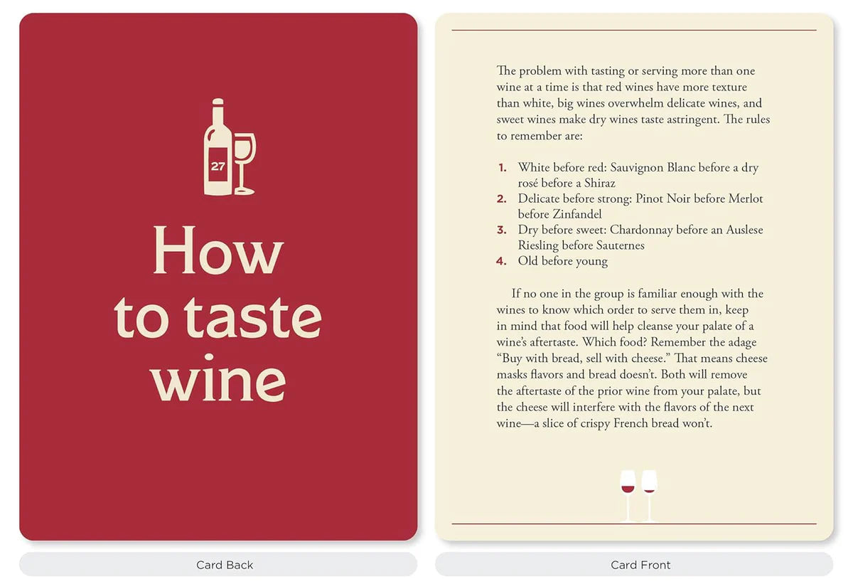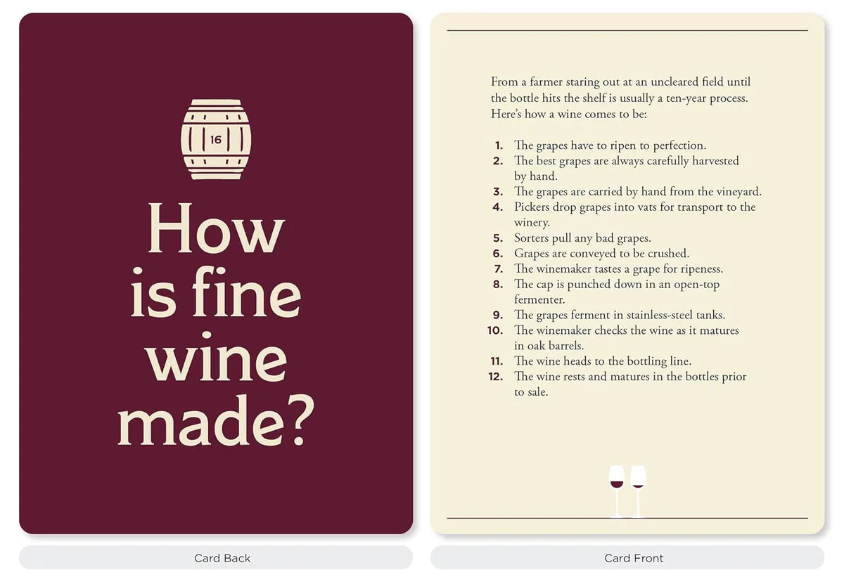 Det er utrolig hvor mye bedre vin smaker med litt kunnskap. Disse 50 illustrerte kortene er fulle av ekspertise og tips, og er stappfulle av informasjon i et vennlig spørsmål-og-svar-format.